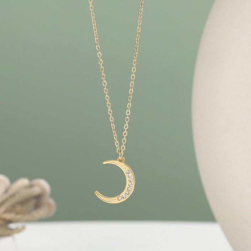 このクレセントムーンペンダントは、シンプルでエレガントなデザインが魅力のプチプラネックレスです。月をモチーフにしたデザインに、小さなダイヤモンド風のストーンがあしらわれており、控えめながらも華やかな印象を与えます。素材には軽量で耐久性のあるチタン鋼を使用しており、錆びにくく、長く愛用できるアイテムです。また、14Kの真空電気メッキ処理が施されており、上品な光沢感が特徴です。